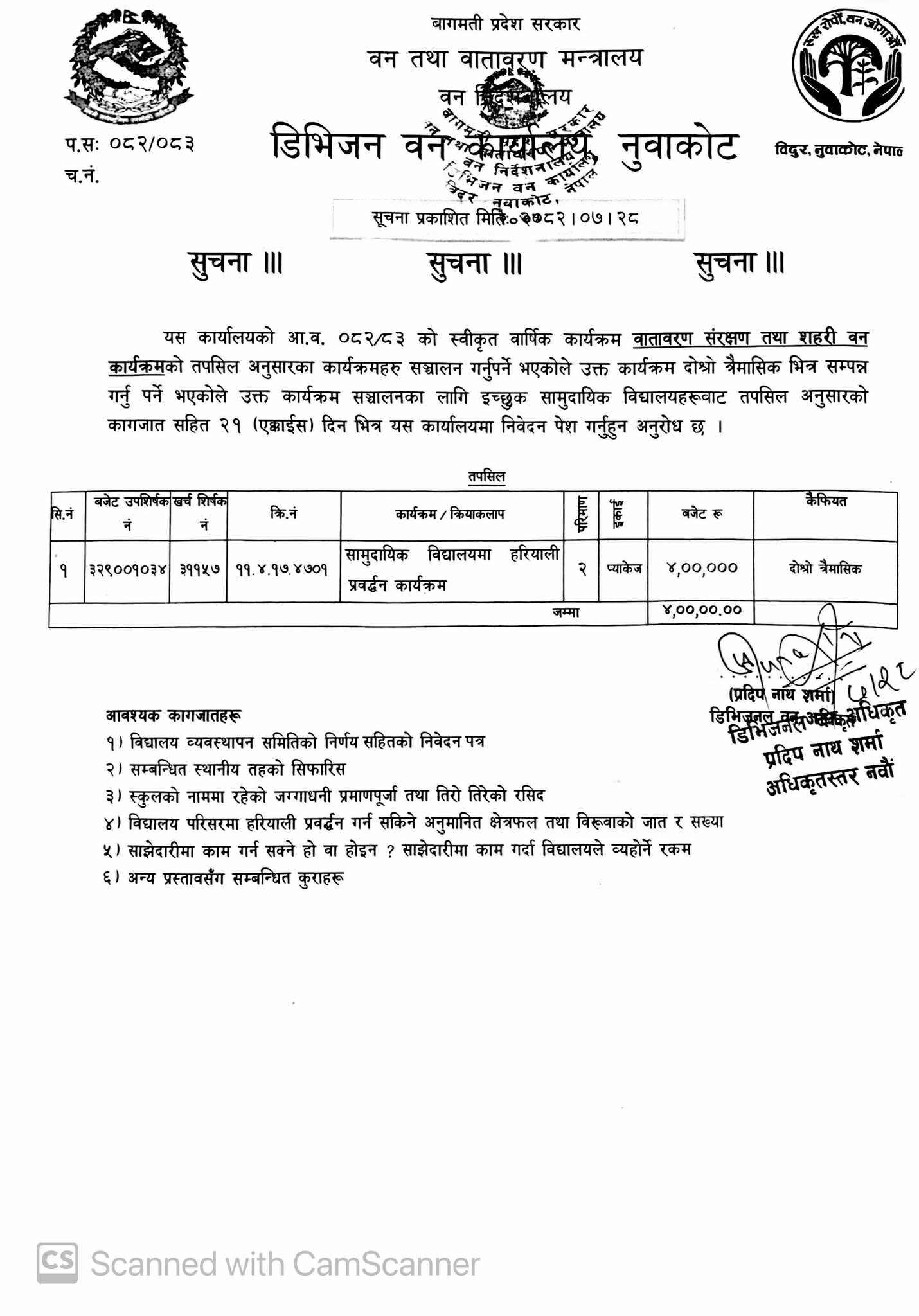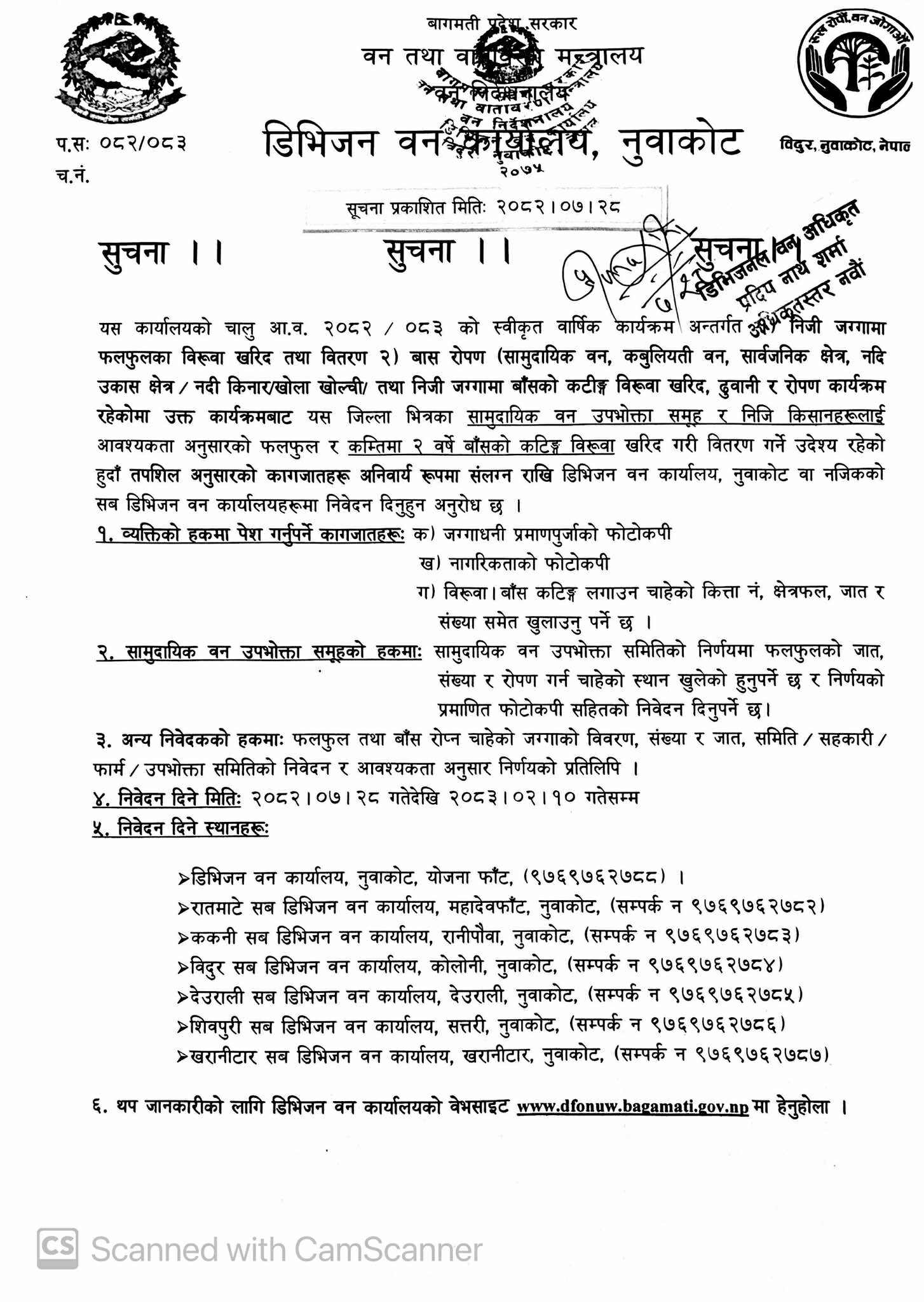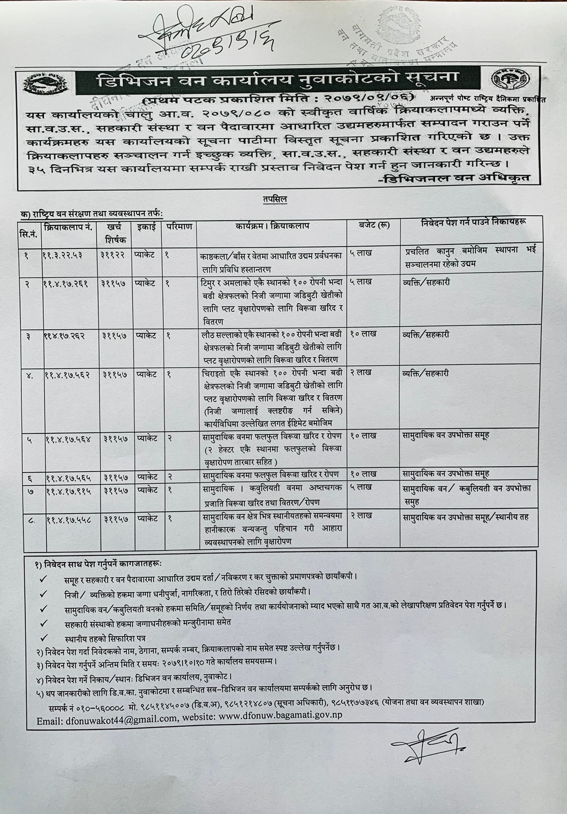 डिभिजन वन कार्यालय, नुवाकोटको आ.व २०७९।०८० तर्फको स्वीकृत वार्षिक कार्यक्रम संचालनको लागि प्रस्ताव आवहान् सम्बनधमा