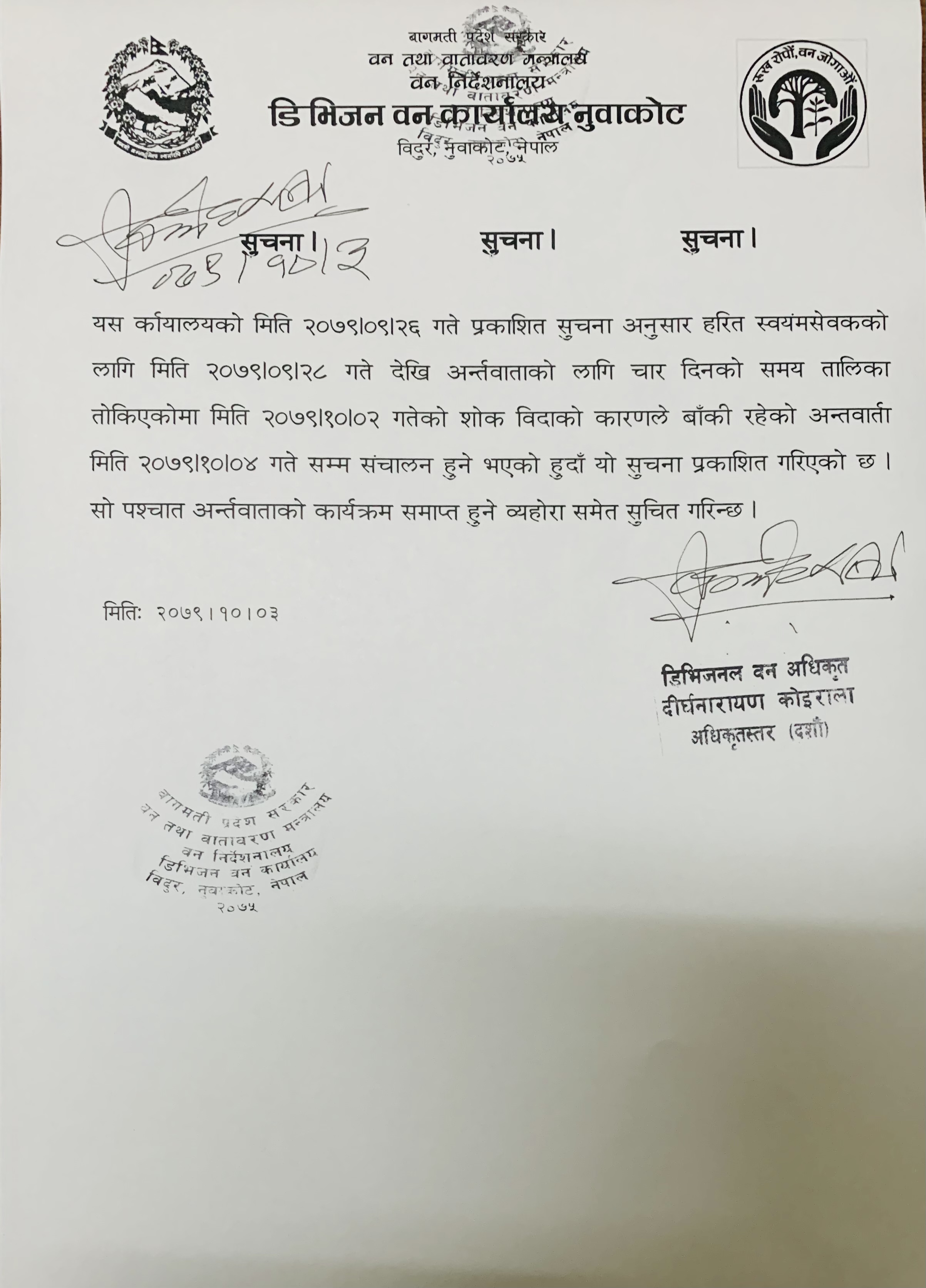 २०७९/१०/०२ गते संचालन हुने हरित स्वयमसेवकको अन्तर्वार्ता स्थगित गरिएको बारे
