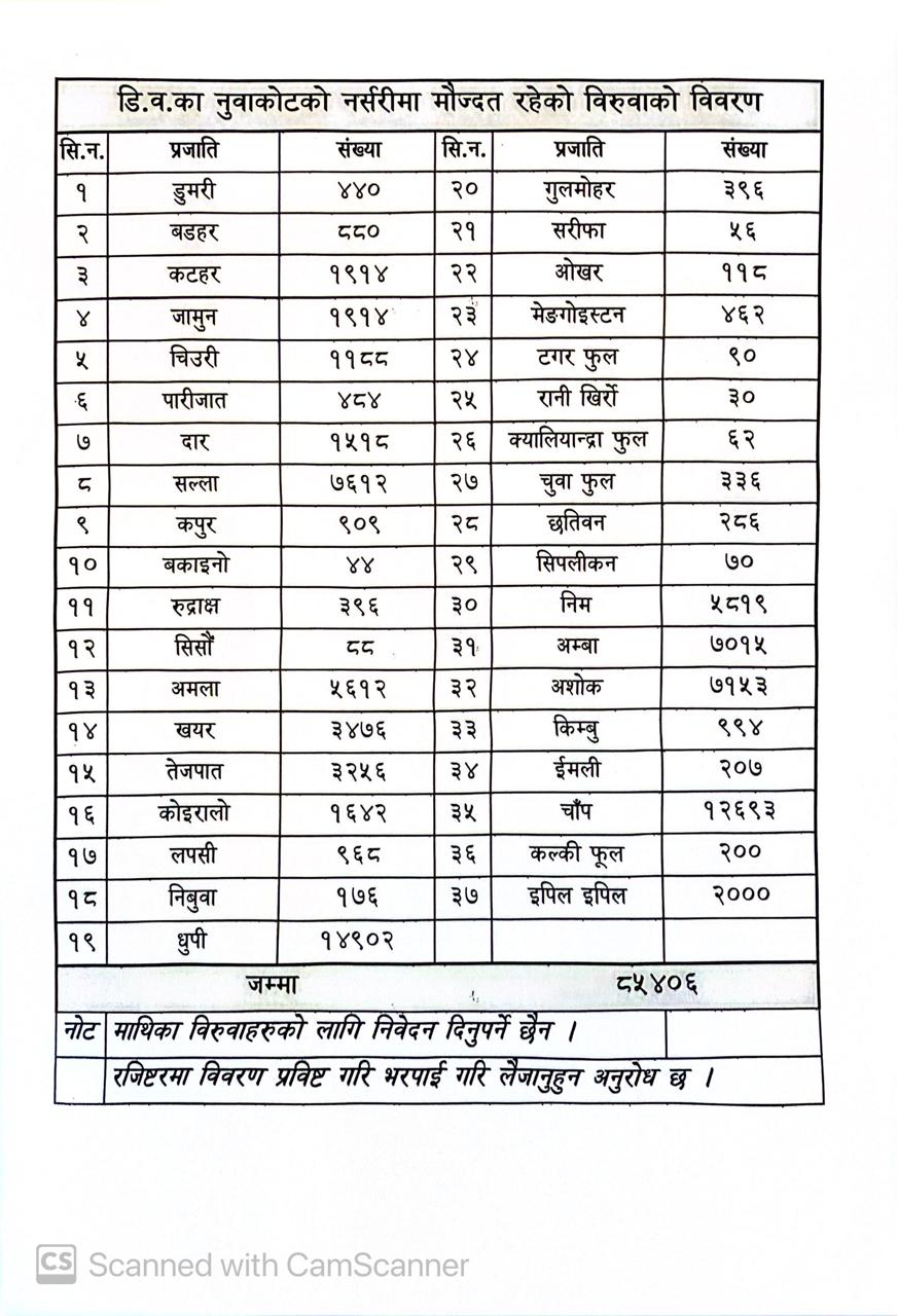 डिभिजन वन कार्यालय नुवाकोटको नर्सरीमा हाल मौज्यात रहेको विरूवाहरूको विवरण