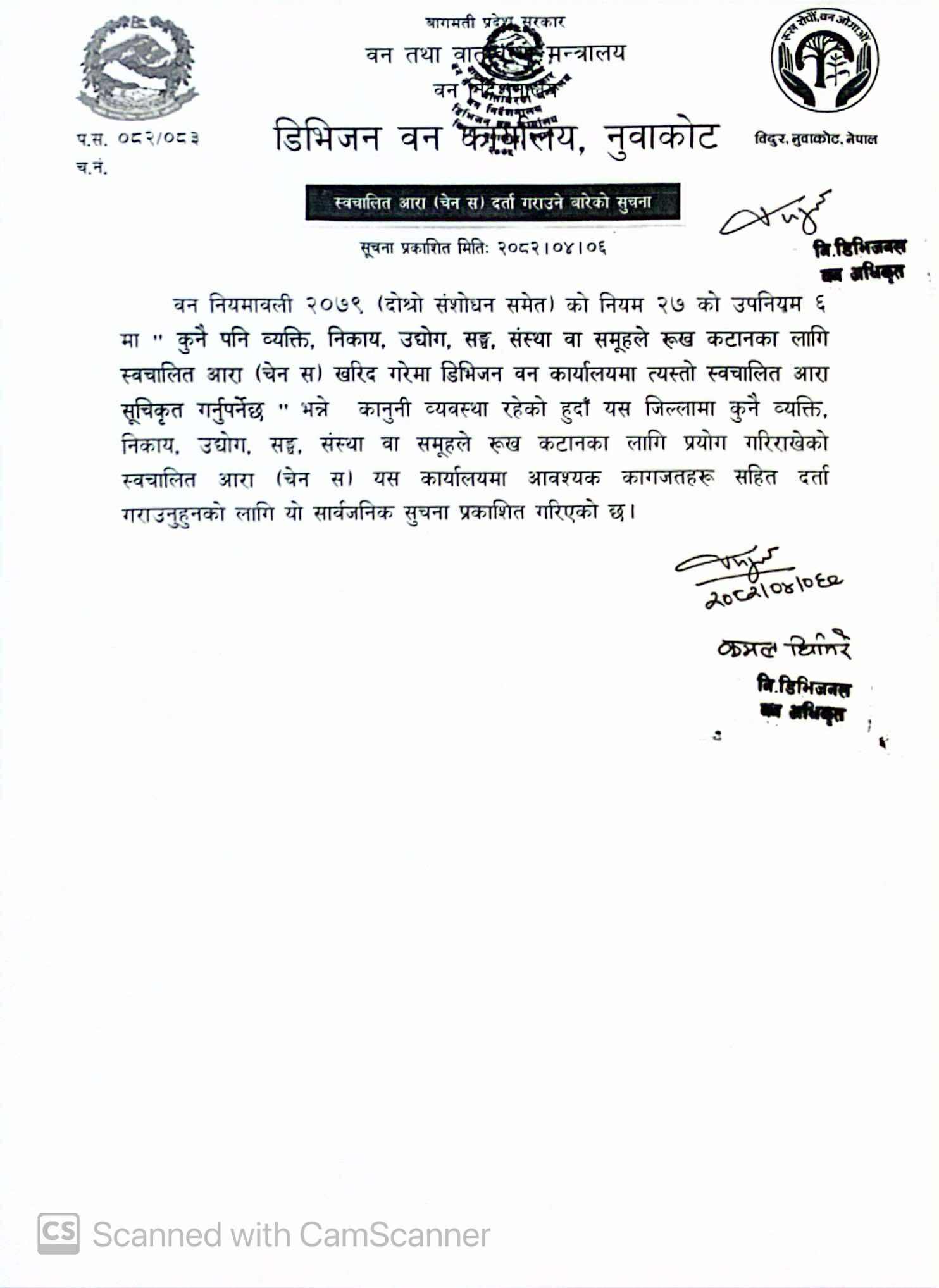 स्वचालित आरा (चेन स) दर्ता गराउने बारेको सुचना
