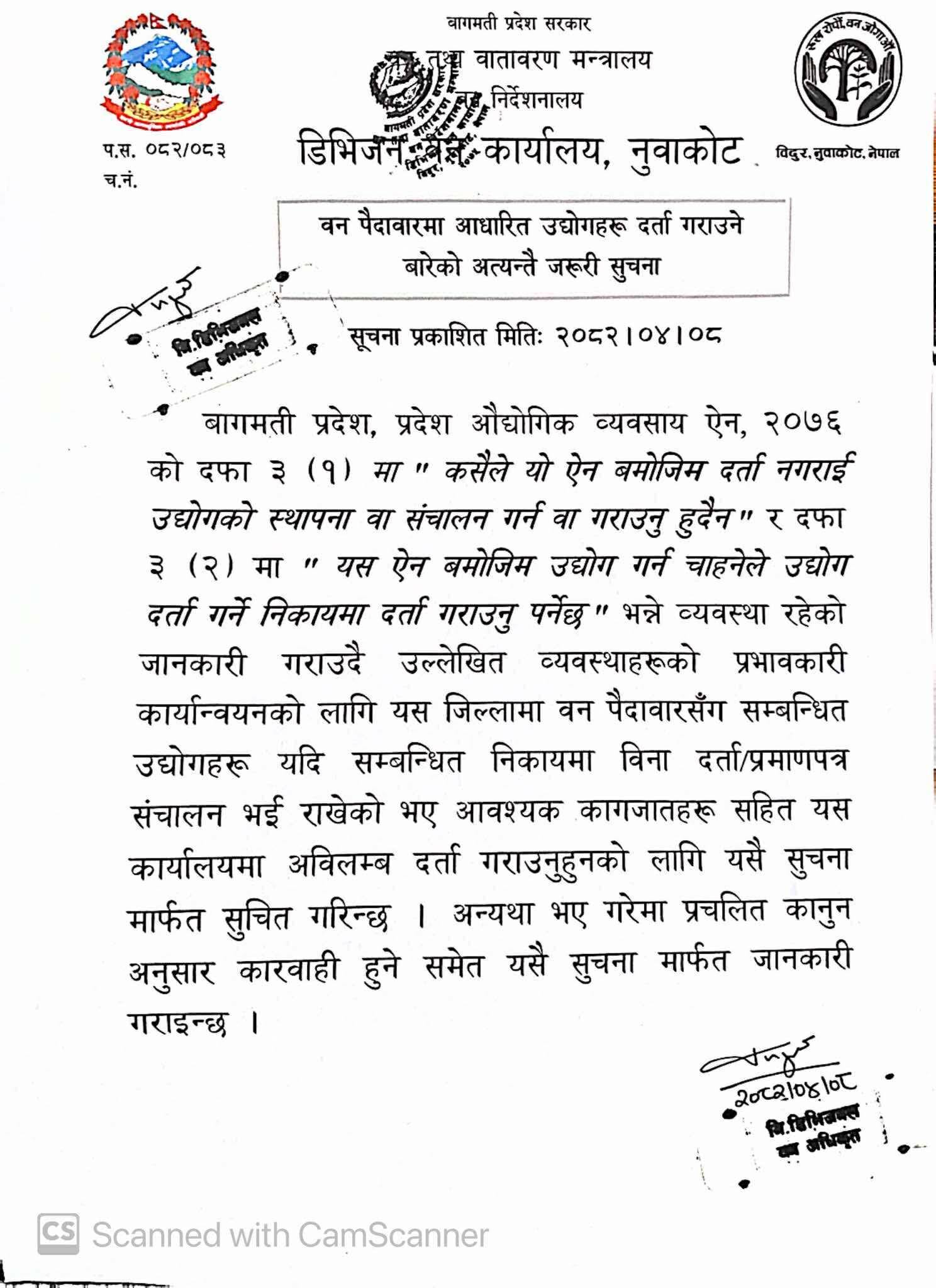 वन पैदावारमा आधारित उद्योग दर्ता गर्ने बारेको अत्यन्तै जरूरी सुचना